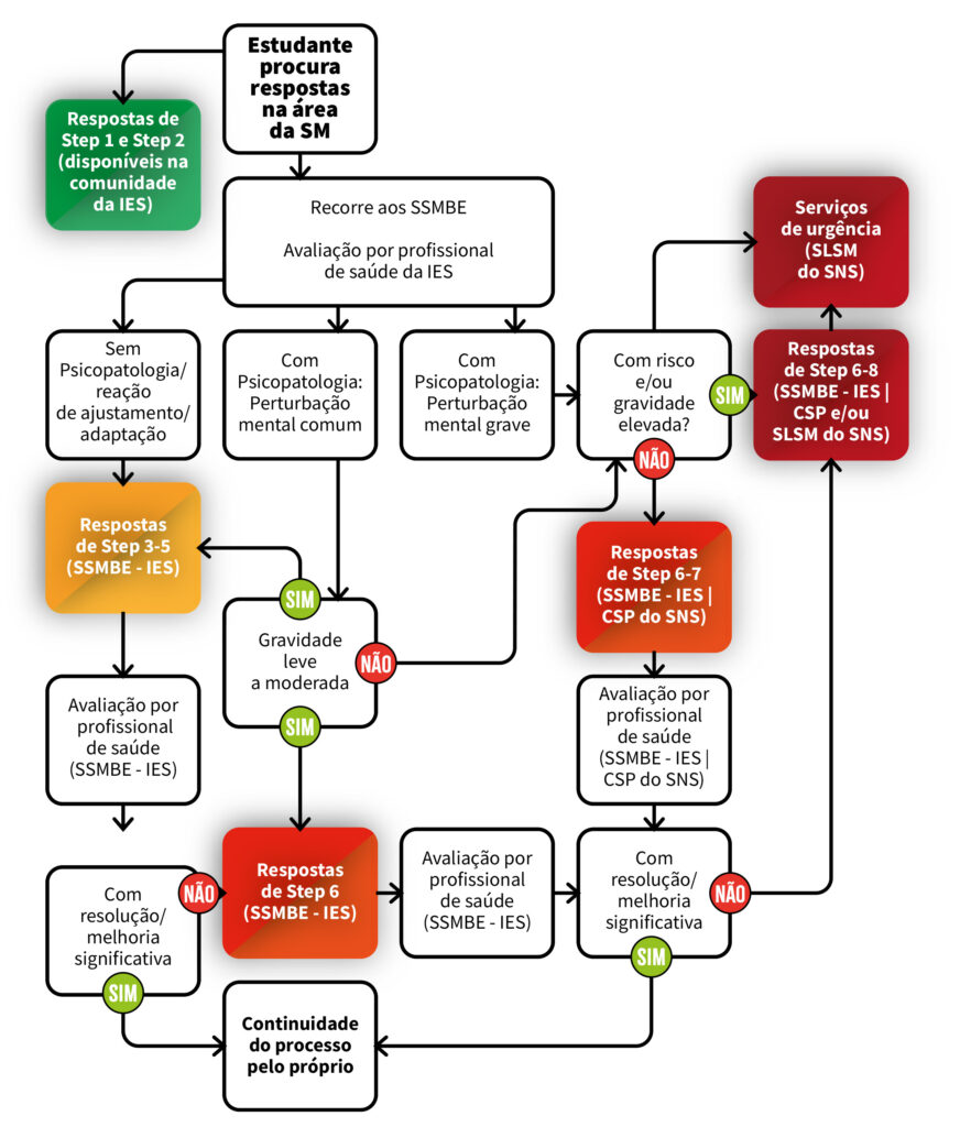 *Fluxograma resumo dos itinerários principais dos estudantes no acesso a respostas na área da saúde mental nas IES (Fonte: Programa para Promoção da Saúde Mental no Ensino Superior, 2023)